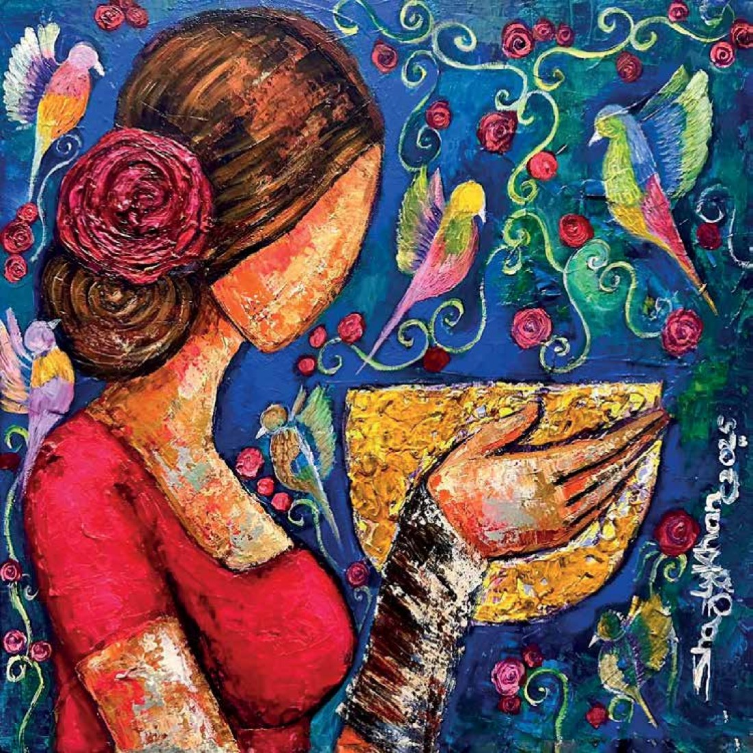 being therapeutic at the same time, bringing joy and inner peace in their lives, as art does the exact thing for me!  I meditate through my paintings and hope to bring some peace and positivity through them to my viewers distracting them from the harsh realities of life. I know life is not a bed of roses. In this turbulent world, I choose and feel the need to intentionally paint the world on a positive note