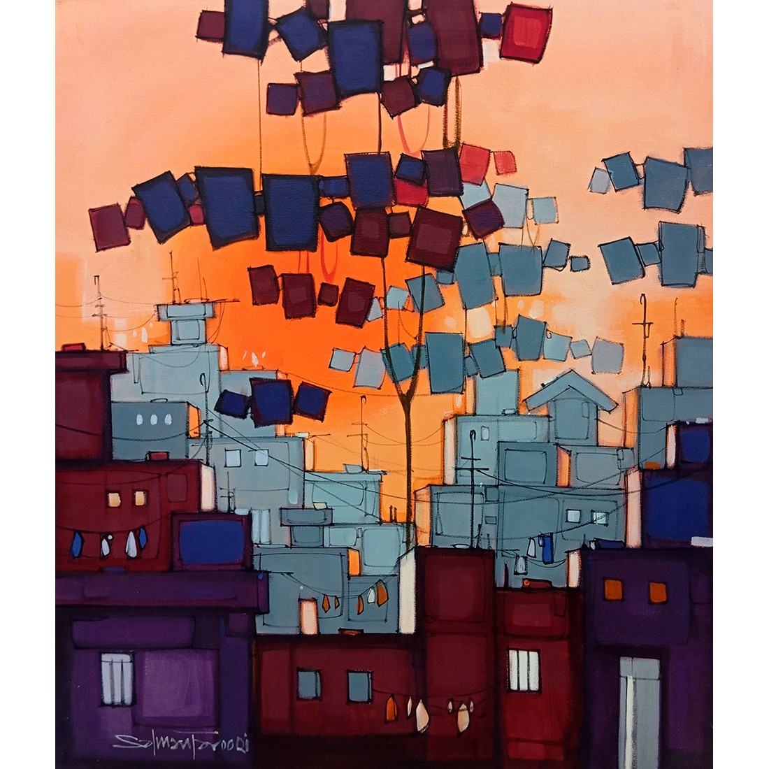 Salman’s work exudes a refreshing energy, his forms are skillfully stylized and simplified into spontaneously created geometric configurations, where smooth lines overlap and traverse the canvases with ease. The paintings are well balanced and the energy floating around captivates the eye while rich color palette and bold compositions help create brilliant effects making the paintings aesthetically pleasing.