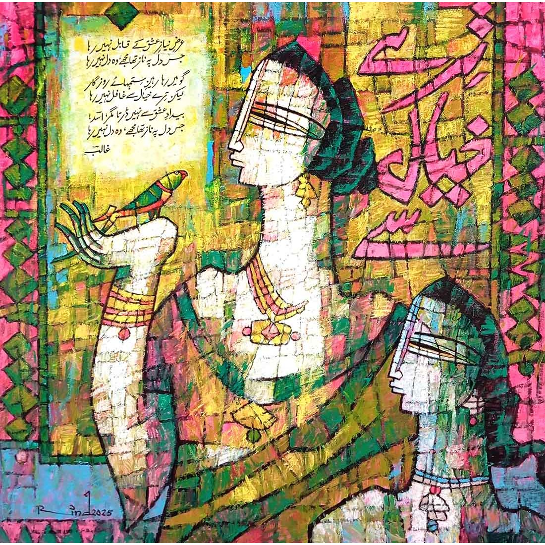 With oil on canvas being his major technique, Rind’s paintings are an abstract but a meaningful play of lines and colors. His work revolves around various moods of traditional and modern women in Pakistan. He depicts different moods of a feminine spirit with commendable craftsmanship and intricacy. Use of a blend of varying colors in harmonious tones in the background is Rind’s signature style.