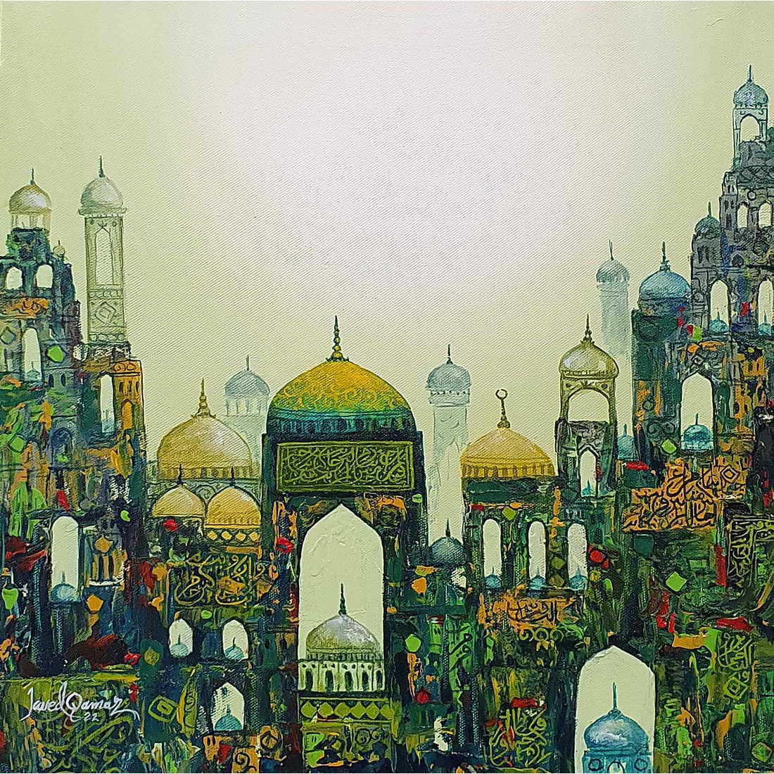 A Self-taught artist from Pakistan describes his calligraphy style as antique. That may be because he is inspired by 16th century calligraphy art. His alphabets in Arabic are very fine as compared to his contemporaries. The use of antique colors combined with silver leafing takes the viewer in the past, leaving them with a sense of excitement. The painting starts from the middle of the canvas and spreads both right and left, exhibiting the broad outlay of a visualization. The depth, exhibited by rather smaller facets, leads one to foreseeing the future. However, with his deep insight in the world of calligraphy, he has worked on this so basic an alphabet. His passion & love for details is evident in his work but he is constantly developing new techniques thus affecting his work, giving it depth, meaning and maturity and this is where the mastery of Javed Qamar becomes evident.