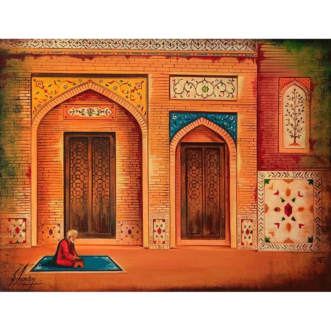 S.A Noory’s emergence on the art canvas in 1998 gave recognition to the magic that he paints in his miniature pieces. The details that he focuses on in his paintings speak for the love that he has for his work. His play with the colors, shadows, lines and presentation of expression tell a story of their own. It is hard to express in words the details that he focuses on in his pieces; be it the embroidery on clothes of the figures or mosaic presentation on the structures that he paints. His works require for an art lover to stand, observe and absorb the fine work that he presents. Only a personal experience with his miniature pieces can explain the feelings that these invigorate
