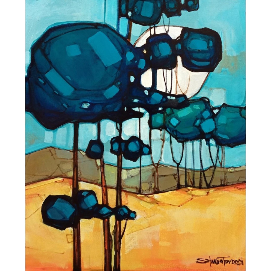 Salman’s work exudes a refreshing energy, his forms are skillfully stylized and simplified into spontaneously created geometric configurations, where smooth lines overlap and traverse the canvases with ease. The paintings are well balanced and the energy floating around captivates the eye while rich color palette and bold compositions help create brilliant effects making the paintings aesthetically pleasing.
